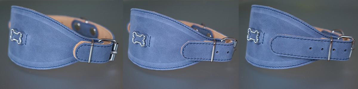 Na fotkách níže můžete vidět, jak obojek vypadá při zapnutí na poslední, střední a první dírku. Obojky s dvojitým zapínáním jsou navrženy s velkým rozsahem délky, aby pejskovi vydržely od štěněte až po dospěláka. Pokud vybíráte obojek pro dospělého pejska, doporučujeme vybírat velikost tak, aby se pejskův obvod krku blížil střední nebo horní hodnotě dané velikosti. V opačném případě bude zapínací pásek příliš vyčnívat z přezky.