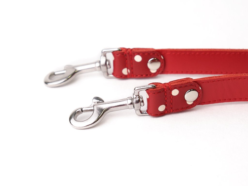 Červená jehnětina s puntíky je klasika, která nikdy nevyjde z módy. Pokud máte rádi věci, které spolu ladí, tento kožený set obojku pro chrty a přepínacího vodítka je přesně ten typ výbavy, který se hodí pro stylové venčení. Pěnové polstrování obojku zajistí vašemu chrtímu parťákovi pohodlí. Sady šijeme z kvalitních lícových usní a kování používáme zásadně nerezové. A abyste se mohli na obojek spolehnout, použili jsme výztuhu pro zvýšení pevnosti v tahu. Díky dvojitému zapínání má obojek širší rozsah nastavení délky – může pejskovi sloužit od štěněcího věku až do dospělosti (více informací zde)