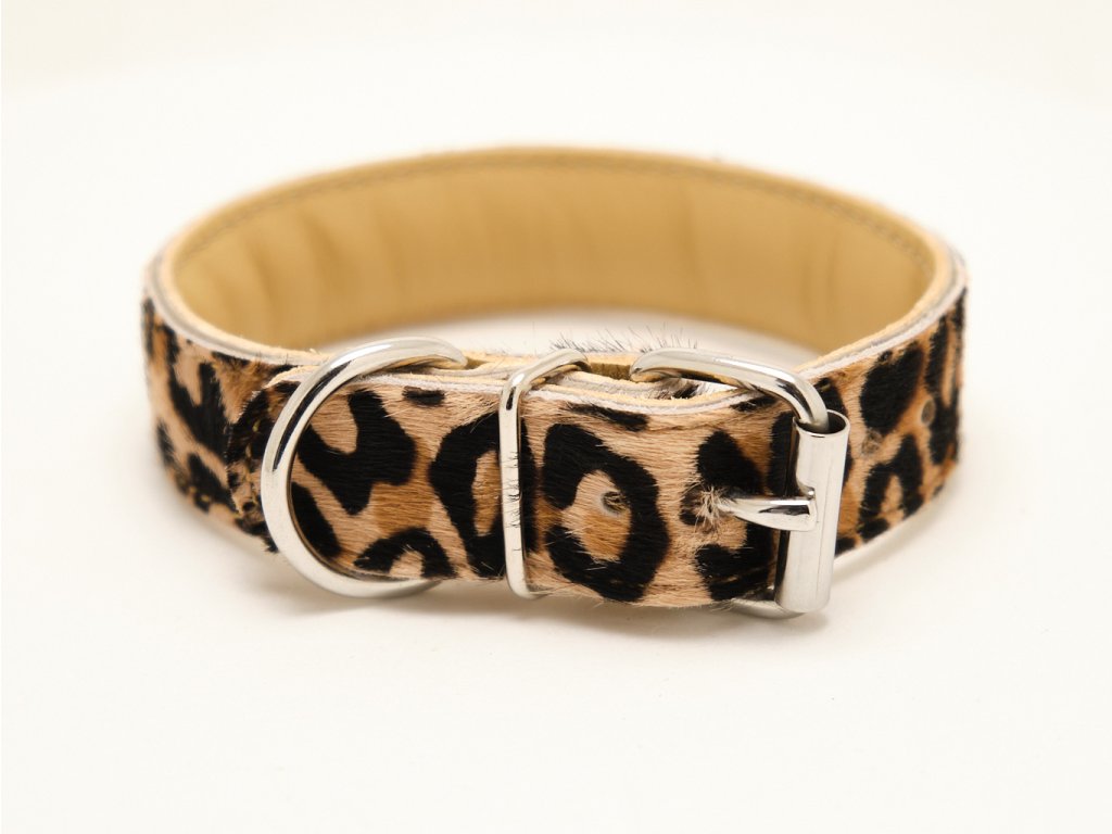 Tento obojek jsme ušili z unikátní kůže typu cavallino s leopardím vzorem.