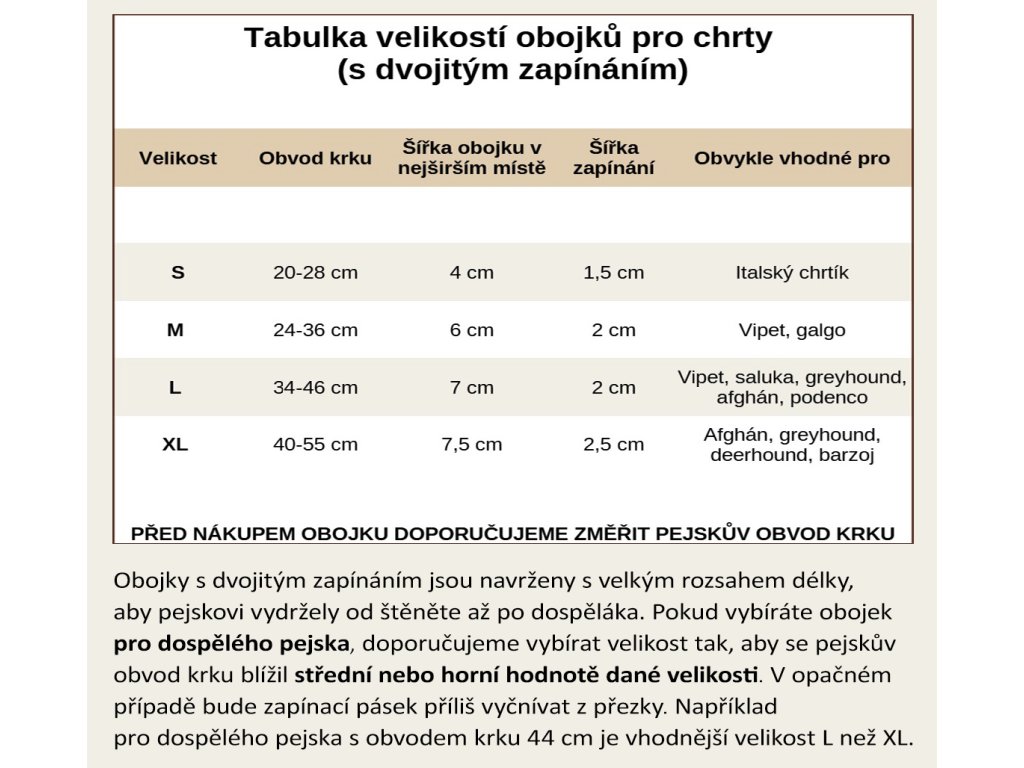 • Rozměry: obojky viz tabulka velikostí v galerii, vodítka dle variant, pouzdro na pytlíky 8 x 4 x 4 cm, obal je vhodný na pas nebo očkovací průkaz o rozměrech 15 x 10 cm