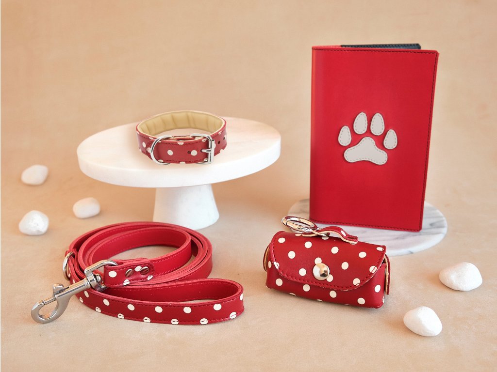 Tato elegantní kožená sada pro psy kombinuje červenou s bílými puntíky pro nadčasový vzhled. Obsahuje obojek s měkkou podšívkou, kožené vodítko a barevně sladěné doplňky, jako je pouzdro na sáčky a obal na očkovací průkaz. Sadu jsme ušili ve Zlíně z designové skopovice a lícové hověziny a pro dlouhou životnost jsme použili nerezové kování.