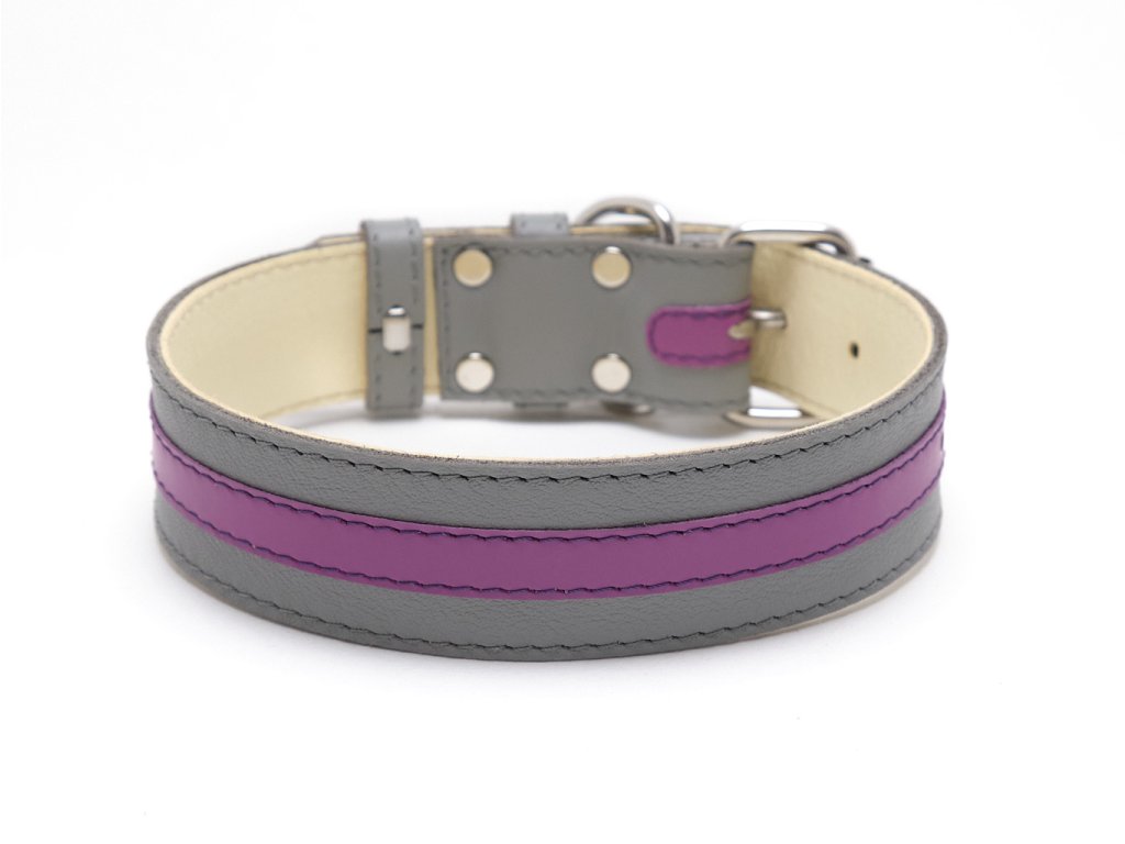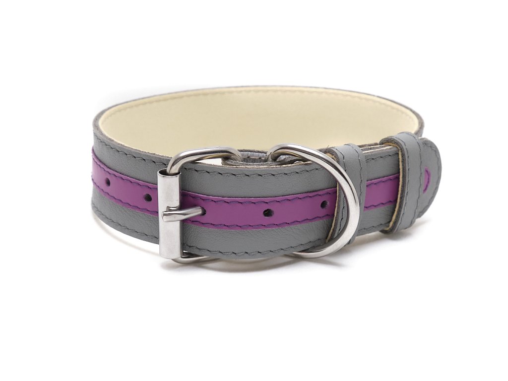 Tato elegantní kožená sada pro psy kombinuje fialovou s šedou barvou. Obsahuje obojek s měkkou podšívkou z vepřovice, kožené vodítko a barevně sladěné doplňky, jako je pouzdro na sáčky a obal na očkovací průkaz. Sadu jsme ušili ve Zlíně z designové skopovice a lícové hověziny a pro dlouhou životnost jsme použili nerezové kování.