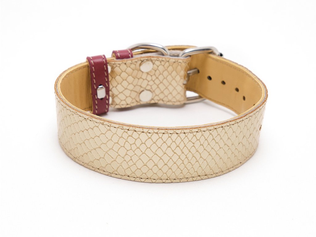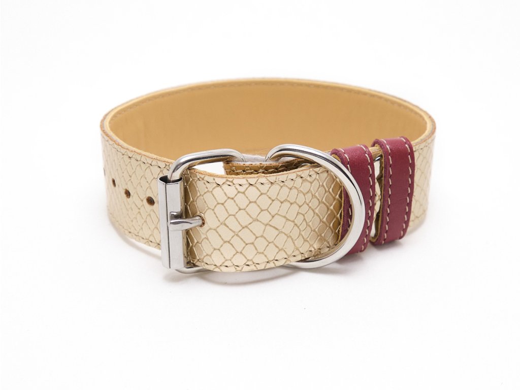 Tato elegantní kožená sada pro psy kombinuje vínovou a zlatou kůži s vytlačenou strukturou hroznýše pro luxusní vzhled. Obsahuje obojek s měkkou podšívkou, kožené vodítko a barevně sladěné doplňky, jako je pouzdro na sáčky a obal na očkovací průkaz. Sadu jsme ušili ve Zlíně z italské lícové hověziny a pro dlouhou životnost jsme použili nerezové kování.