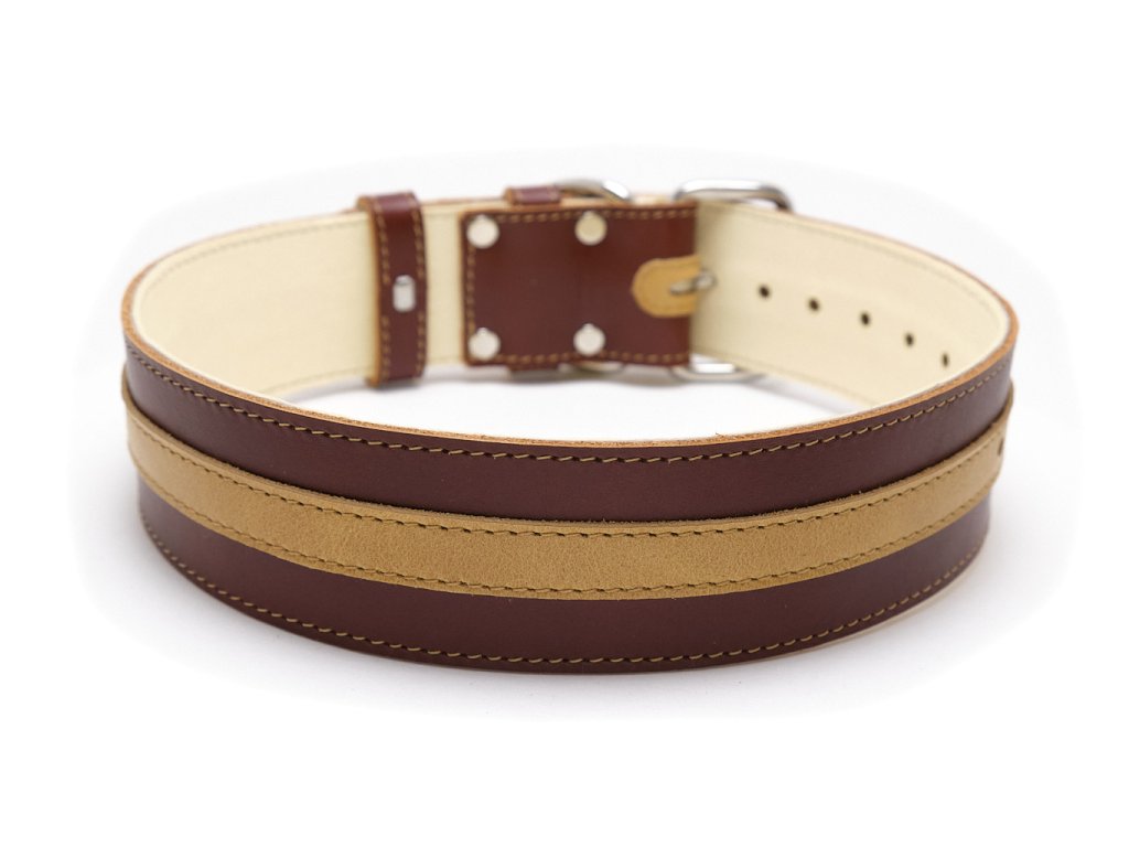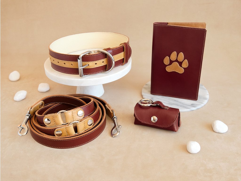 Tato elegantní kožená sada pro psy kombinuje zlatou s koňakovou barvou pro harmonický vzhled. Obsahuje obojek s měkkou podšívkou, kožené vodítko a barevně sladěné doplňky, jako je pouzdro na sáčky a obal na očkovací průkaz. Sadu jsme ušili ve Zlíně z italské lícové hověziny a pro dlouhou životnost jsme použili nerezové kování.