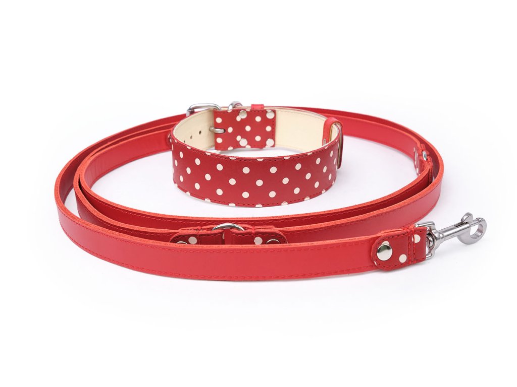 Obojek a přepínací vodítko – červený set s puntíky