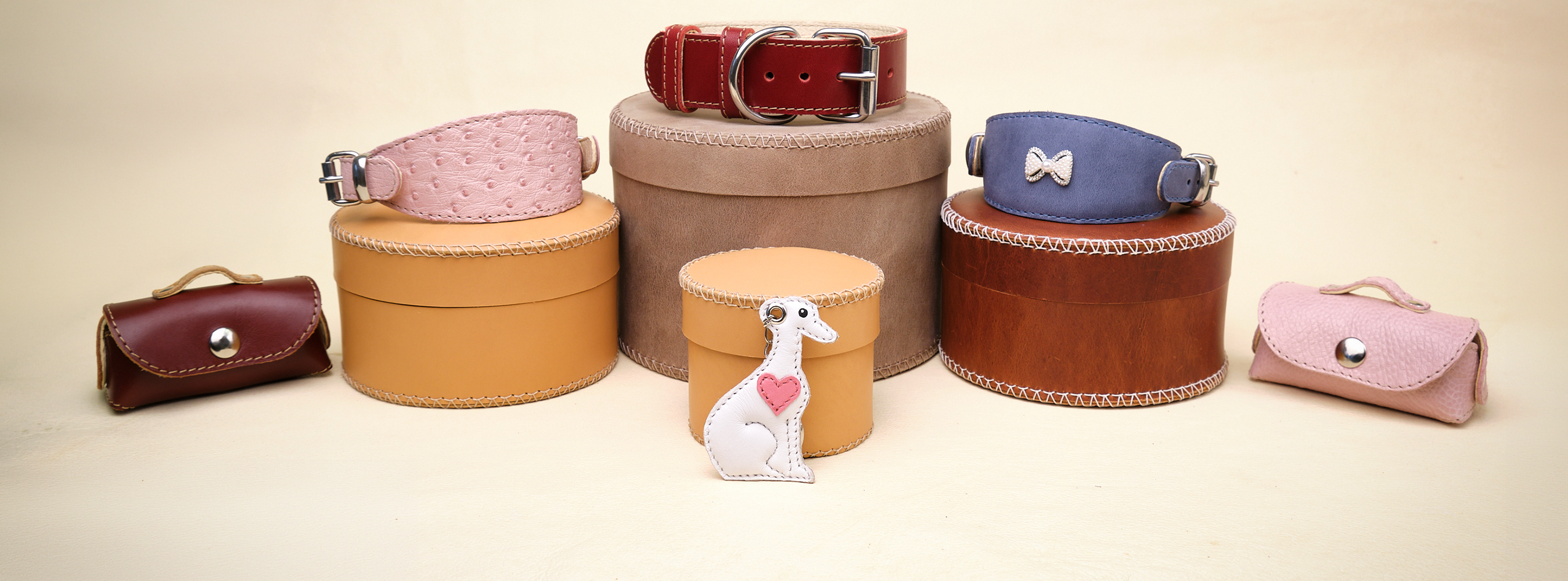 Malá ukázka našeho vlastního sortimentu - kožené obojky, doplňky a dárkové krabice / úložné boxy
